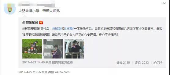 例如去年的馬蓉出軌,一些粉絲就跑到王寶強的微博下評論:宋喆的微博找到了!@帶帶大師兄。