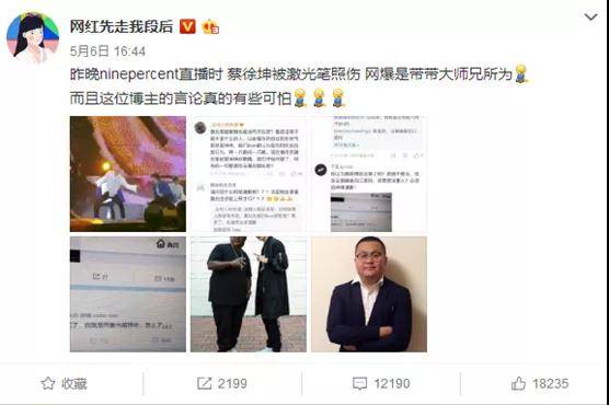 舞台上的蔡徐坤被激光射到眼睛,突然中斷了動作,彎腰緩了一陣之後才起身繼續舞蹈。這一幕被粉絲捕捉到並且在網絡上瘋狂傳播,很快便成為了娛樂圈的熱門話題。