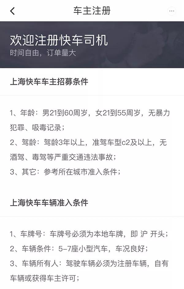在快車司機註冊條件中,對司機的年齡、駕齡、違章、違法記錄,車輛號牌和狀況都做出了要求:“男21週歲到60週歲,女21週歲到55週歲,無暴力犯罪、吸毒記錄”“無酒駕毒駕等嚴重交通違法事故”等。
