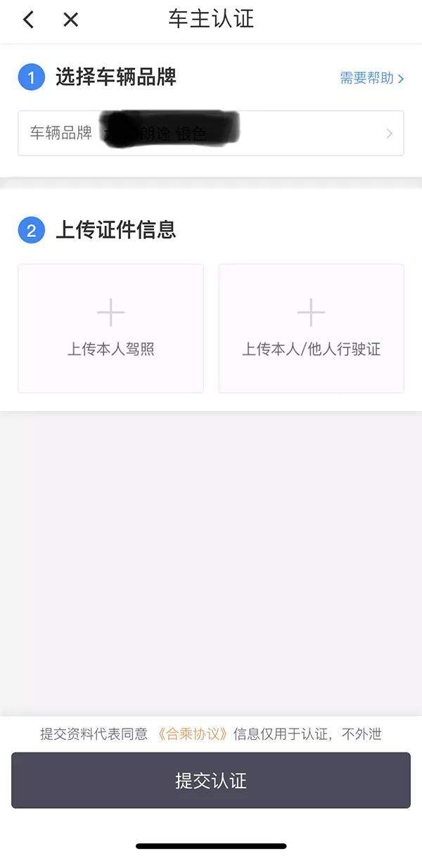 記者體驗了滴滴順風車司機的註冊流程。根據軟件的提示,註冊成為車主首先需要選擇車型參數,包括車輛品牌、車型和顏色,之後需要提交行駛證和駕駛證的照片**(行駛證和駕駛證可以非同一人)**。