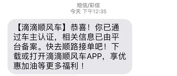 在註冊大約兩個小時後,記者收到了來自滴滴的短信通知,稱證件已通過審核,即刻可以在平台上接單,而平台並未要求繼續完成芝麻信用、職業認證、人臉識別等其他認證。