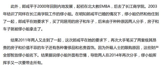 **郎教授和第n任妻子和平分手後,曾與在長江商學院認識的繆某交往2年多,為她在靜安、松江買了兩套房。**一套在繆某名下,一套在繆某父親名下。
