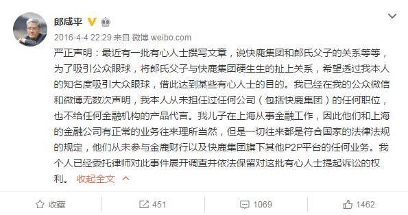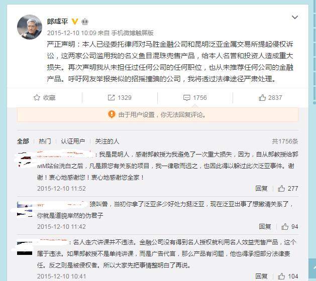 事情一出,郎鹹平馬上在微博中表示:“從不為金融機構推薦產品,也不為金融機構代言”,極力撇清與其“站台”的大型平台的關係。