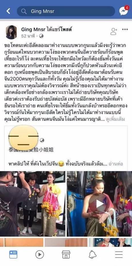 (泰國網紅變臉小妹FB懟網友、罵中國遊客的截圖)
