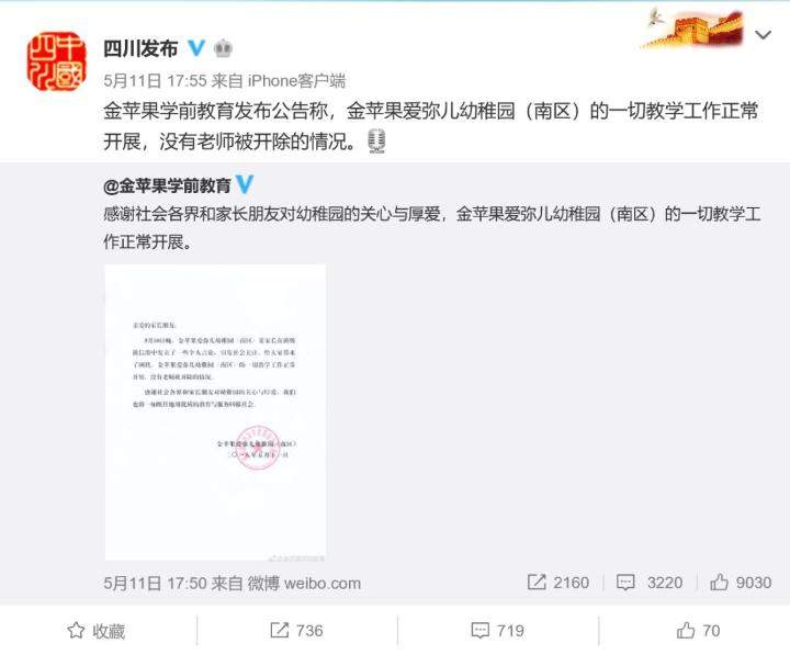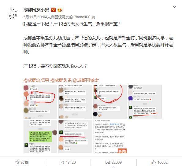 此前據成都本地知名博主@成都網友小張爆料,成都金蘋果愛彌兒幼兒園班上有位女孩打同學,老師將她單獨安排座位的決定誤發到了家長羣裏。隨後女孩家長在羣裏威脅説:“陳老師,你馬上在全班當着所有師生給嚴××道歉,否則我通知你們集團領導來給我解釋你對嚴書記女兒説這話什麼意思!!”之後又聲稱,學校處理結果已出,開除陳老師。