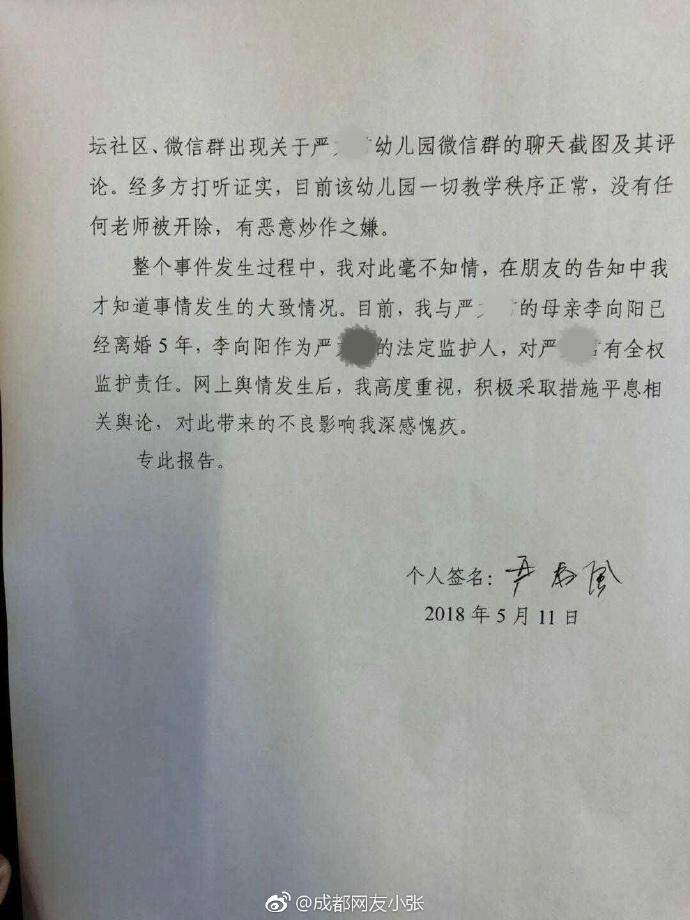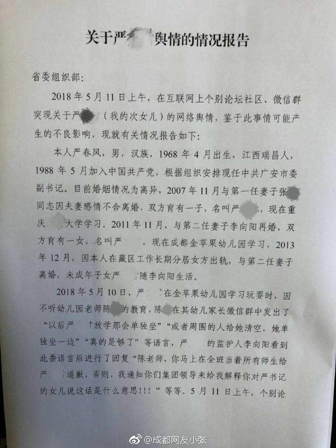幼兒園聲明稱未辭退教師,是迫於壓力暫時不辭退還是老師已辭職不存在辭退?網上流傳一份廣安市委副書記嚴春風寫給四川省委組織部的情況説明,情況説明中稱他和妻子已離婚。這個又是不是屬實?