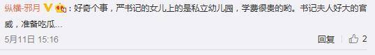 @網友縱橫-邪月:好奇個事,嚴書記的女兒上的是私立幼兒園,學費很貴的喲。書記夫人好大的官威,準備吃瓜…