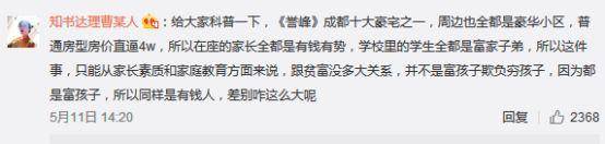 @網友知書達理曹某人:給大家科普一下,《譽峯》成都十大豪宅之一,周邊也全都是豪華小區,普通房型房價直逼4w,所以在座的家長全都是有錢有勢,學校裏的學生全都是富家子弟,所以這件事,只能從家長素質和家庭教育方面來説,跟貧富沒多大關係,並不是富孩子欺負窮孩子,因為都是富孩子,所以同樣是有錢人,差別咋這麼大呢?