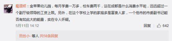 @網友蜀道煩:金蘋果幼兒園,每月學費一萬多,校車費兩千,這在成都是什麼消費水平呢,遠遠超過一個副廳級領導的工資上限。另外,在這個學校上學的家庭多是富貴人家,一個他市的市委副書記能否有如此大的能量,實在令人懷疑。
