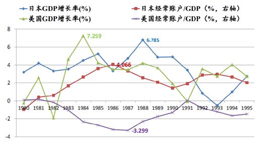 1985年9月,美國拉着英國、德國等國(G5)與日本談判,最後達成廣場協議。廣場協議的簽訂是因為當時美國的貿易逆差有40%來自日本,所以為了解決逆差,美國希望日元能夠升值。在談判中,迫於美國要對美元主動貶值的威脅,日本不得不將日元升值。此後三年,美元相對日元貶值了一半,這一貶值刺激了美國的出口,極大的改善了美國的經常賬户。