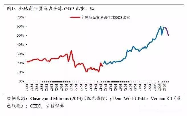 第二次世界大戰結束以來,相對於全球的GDP,全球的貿易經歷了一輪又一輪大幅度的上升。從1945年到現在,在這70年的時間裏,相對於全球的經濟增長,全球貿易在以更快的速度成長。全球化在商品貿易以及後來在生產層面上深刻的展開,在一定程度上大大刺激了全球經濟的增長和人們生活水平的提高。