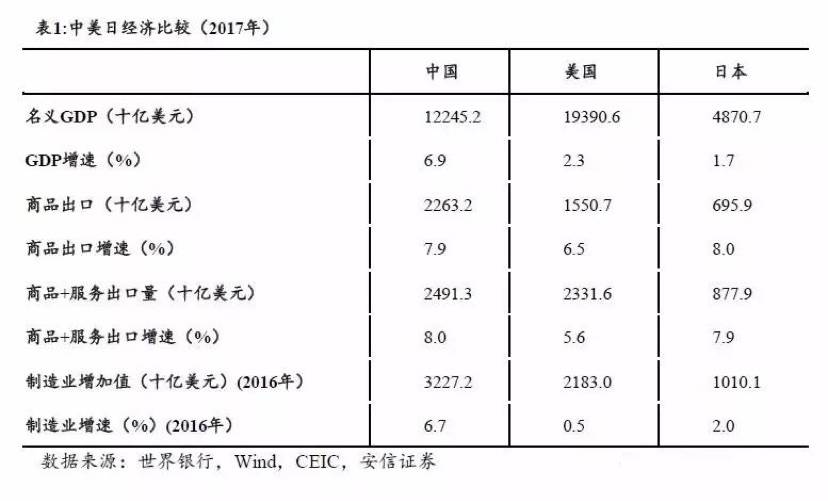 表1是基於2017年的數據,對中、美、日經濟產出的基本比較。2017年,中國GDP是12萬億美元,美國是19萬億美元,世界第三大經濟體日本GDP不到5萬億美元。中國的經濟總量已經是日本的2.5倍。