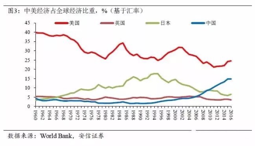 在二次世界大戰結束的時候,以市價匯率計算,美國的經濟產出佔到全球近一半的比重。到1960年,這一比例仍然有40%。現在,以市價匯率計算這一比例仍然有1/4,美國仍然是全球第一大經濟體。