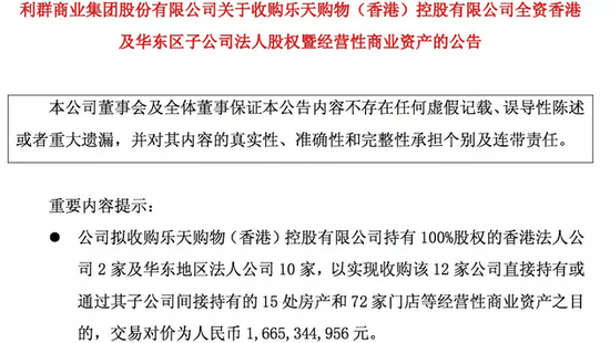 5月11日晚間,利羣股份(601366,SH)發佈公司稱,公司擬收購樂天購物(香港)控股有限公司旗下的2家香港法人公司,以及10家華東地區法人公司,這些公司旗下資產包括15處房產和72家門店等經營性商業資產。這筆交易對價為人民幣16.65億元。