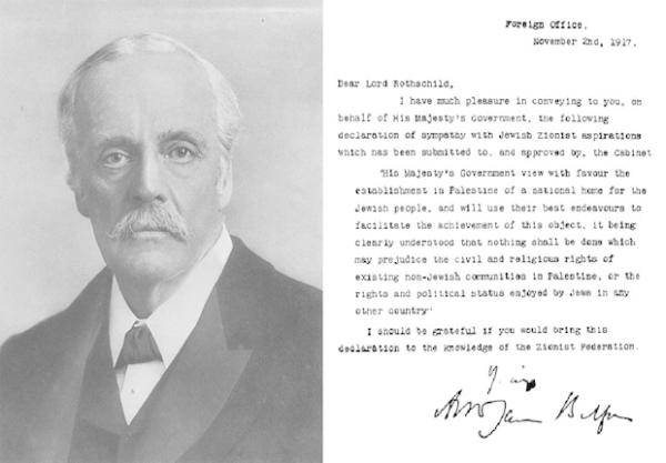 《貝爾福宣言》是英國政府表示贊同猶太人在巴勒斯坦建立國家的公開保證,是世界主要國家正式支持猶太人迴歸巴勒斯坦的第一個宣言。 1917年11月2日,英國外交大臣A.J.貝爾福致函英國猶太復國主義者聯盟副主席L.W.羅思柴爾德。 這封信後來被稱為貝爾福宣言。
