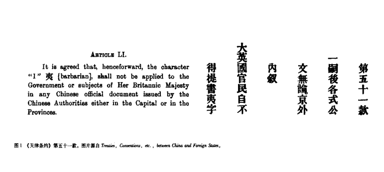 鴉片戰爭之後,英帝國外交口的“中國通”們突然發現,中國的官方文件中仍然用“夷”這個字指稱洋商和中國打交道的西洋軍官,而“夷”翻譯成英語有個慣用詞barbarian(野蠻人),這個詞是大英帝國開疆闢土征服低等種族的術語,怎麼中國人膽敢反過來稱呼英帝國的臣民?暴怒之下引發了一場不小的外交事故。最終,卑躬屈膝的清政府在1858年簽訂《天津條約》的時候,加上了“第51特別款”,明令禁止“夷”——這樣一個讓洋大人不愉快的字眼再出現在正式的外交文書中。