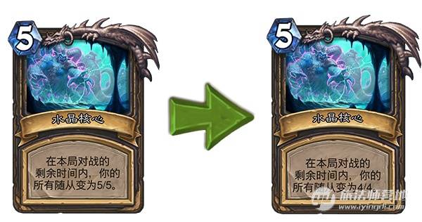 任務獎勵“水晶核心”效果將會變為:在本局對戰的剩餘時間內,你的所有隨從變為4/4(由5/5下調)