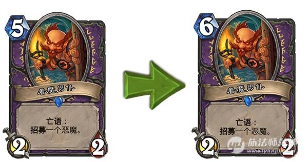隨着渡鴉年的環境更替,惡毒的召喚師在攜帶10費法術的套牌中變得更強大,也更穩定。這是因為標準模式中10費隨從卡牌變少了,所以玩家可以通過惡毒的召喚師來更穩定地獲得強大的隨從。即使考慮到在構築套牌時要為利用惡毒的召喚師而做出犧牲,我們也認為將該卡牌的法力值消耗提高為7點,才能符合與“終極感染”這樣的卡牌搭配時產生的效果。