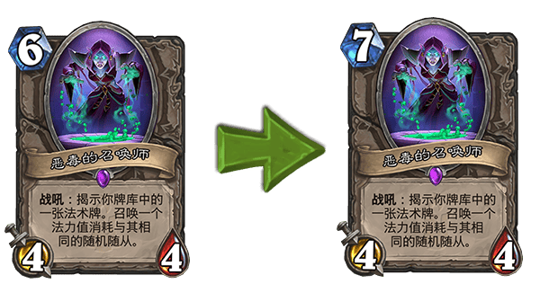 隨着渡鴉年的環境更替,惡毒的召喚師在攜帶10費法術的套牌中變得更強大,也更穩定。這是因為上古之神、卡拉贊和加基森退入狂野模式,標準模式中10費隨從卡牌變少了,所以玩家可以通過惡毒的召喚師來更穩定地獲得強大的隨從(穩定死亡之翼就問你怕不怕)。這次的改動還算合理,與“終極感染”的配合稍稍削弱,不至於瞬間顛覆戰場局勢。