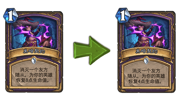 有意思的是,黑暗契約也被削弱(這是強行削弱術士?)。黑暗契約有兩個使其非常強大的因素。它的法力值消耗為1點,使其可以輕鬆地和食肉魔塊、着魔男僕以及靈魂歌者安布拉配合,在一回合內打出強大的卡牌組合。它同時能為術士提供大量的治療,這使得激進地使用生命分流、狗頭人圖書管理員和地獄烈焰這類卡牌的不良效果被輕鬆抵消。這次改動大大降低了治療效果,術士們應當更謹慎地使用生命分流以及負面作用的卡牌。