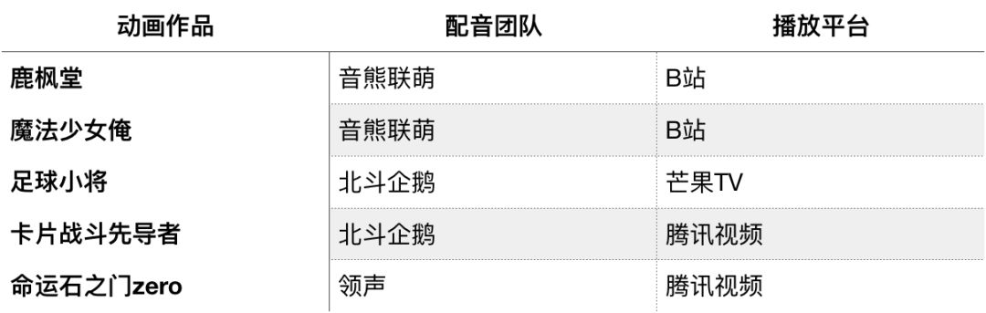 這5部作品中,由芒果TV獨播、面向兒童觀眾的《足球小將》以及被騰訊視頻歸納入少兒頻道的《卡片戰鬥先導者》出現中文配音版,主要受眾是少年兒童,為其進行中文配音無可厚非。