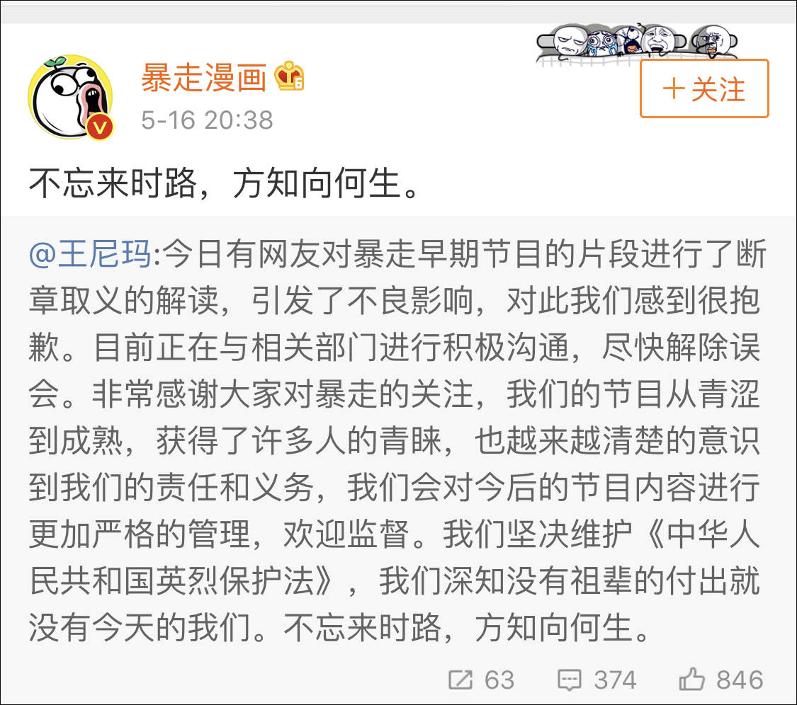 隨後,“暴走漫畫”官微轉發該微博,並配文“不忘來時路,方知向何生”。