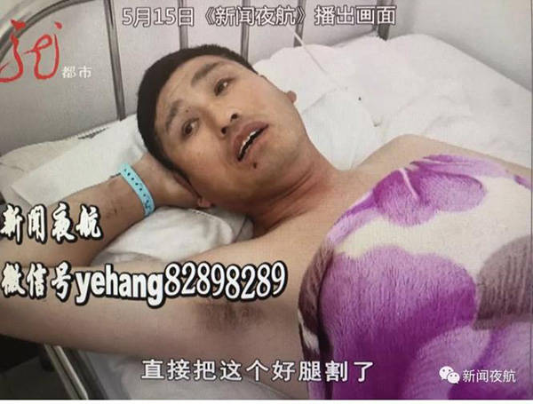 前兩天,綏化安達市民王成有在工地幹活的時候,不小心摔壞了右腿,於是來到了安達市濟仁醫院接受治療。經過初步診斷,他的右腿韌帶撕裂,5月12日,他在安達市濟仁醫院接受了手術治療。然而手術後,他的左腿, 也就是沒有傷的腿,居然出現了一個傷口,而且還被縫了14針。