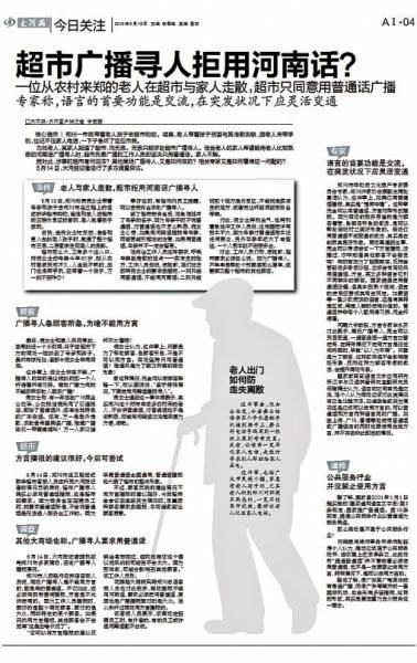 來鄭老人與家人走散,超市廣播尋人拒用河南話,只能普通話廣播?_風聞
