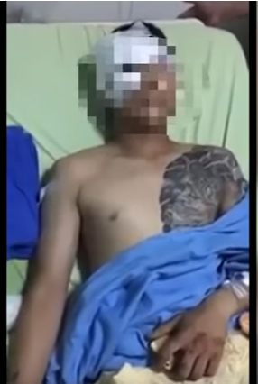 從畫面中可以看出,該受傷士兵赤裸上身,頭部包着紗布躺在病牀上,臉頰還沒完全消腫,眼睛腫成一條線,但其身體左側的巨型紋身非常搶眼。