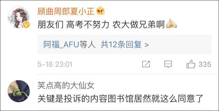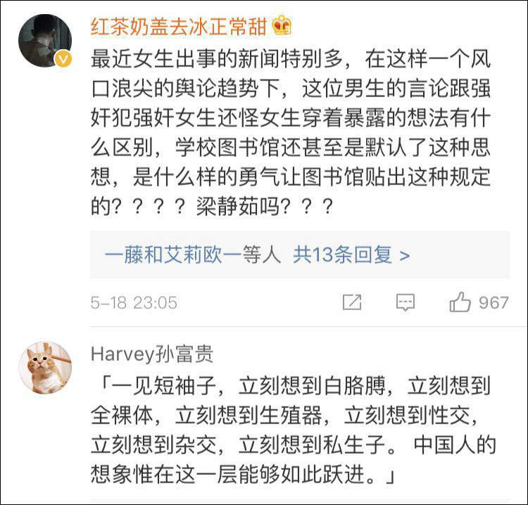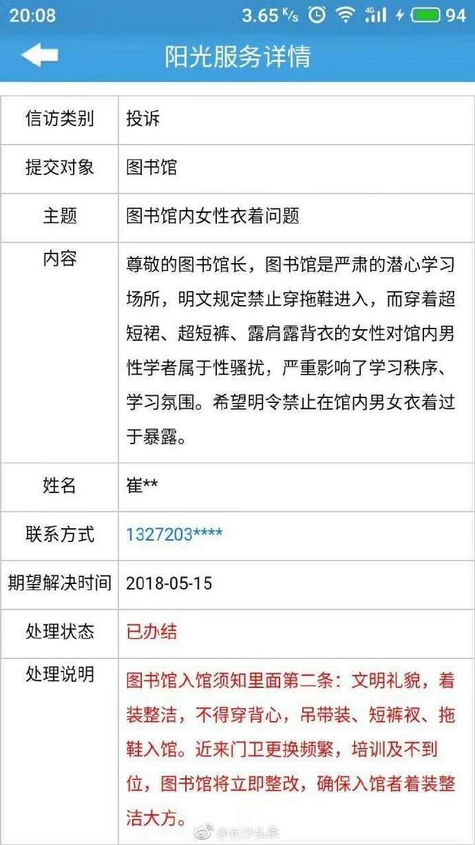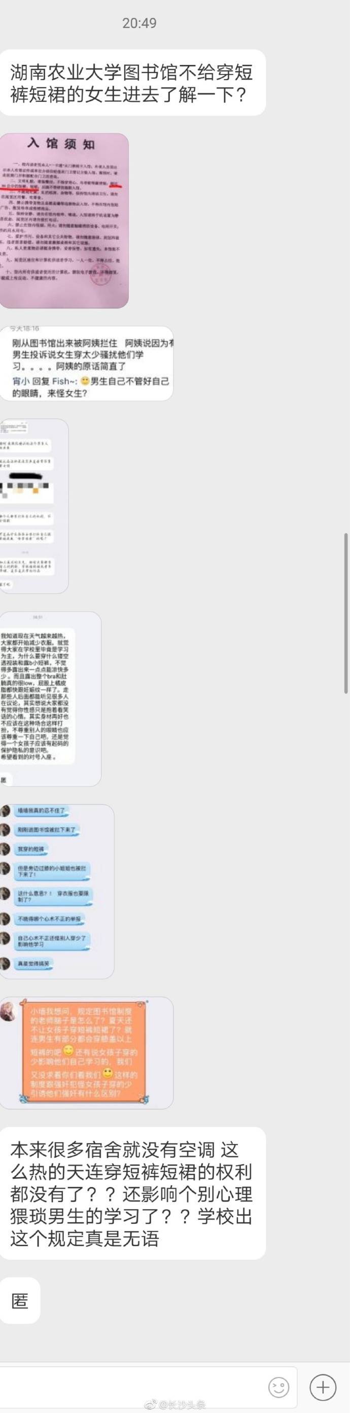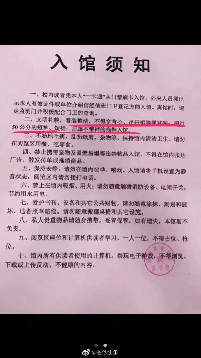 昨天(18日)晚上,有網友給@長沙頭條 投稿,稱湖南農業大學有學生向圖書館館長投訴,穿超短裙,超短褲,露肩露背衣的女性,對館內男性學者是性騷擾,嚴重影響學習秩序,學習氛圍,建議明令禁止館內男女穿着過於暴露。