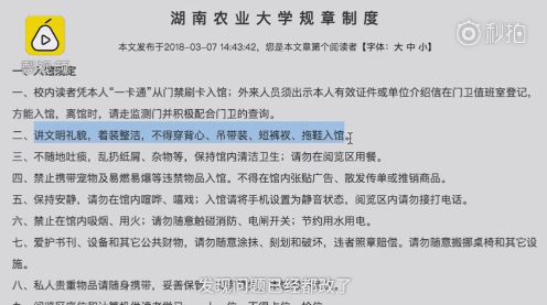 19日下午,有媒體採訪到了湖南農業大學圖書館辦公室的工作人員,該工作人員稱,上述入館須知發佈後很短時間內已經及時撤銷。目前公開的入館須知已經沒有了“50公分”的概念,原來的規定只是不能穿着背心、短褲。