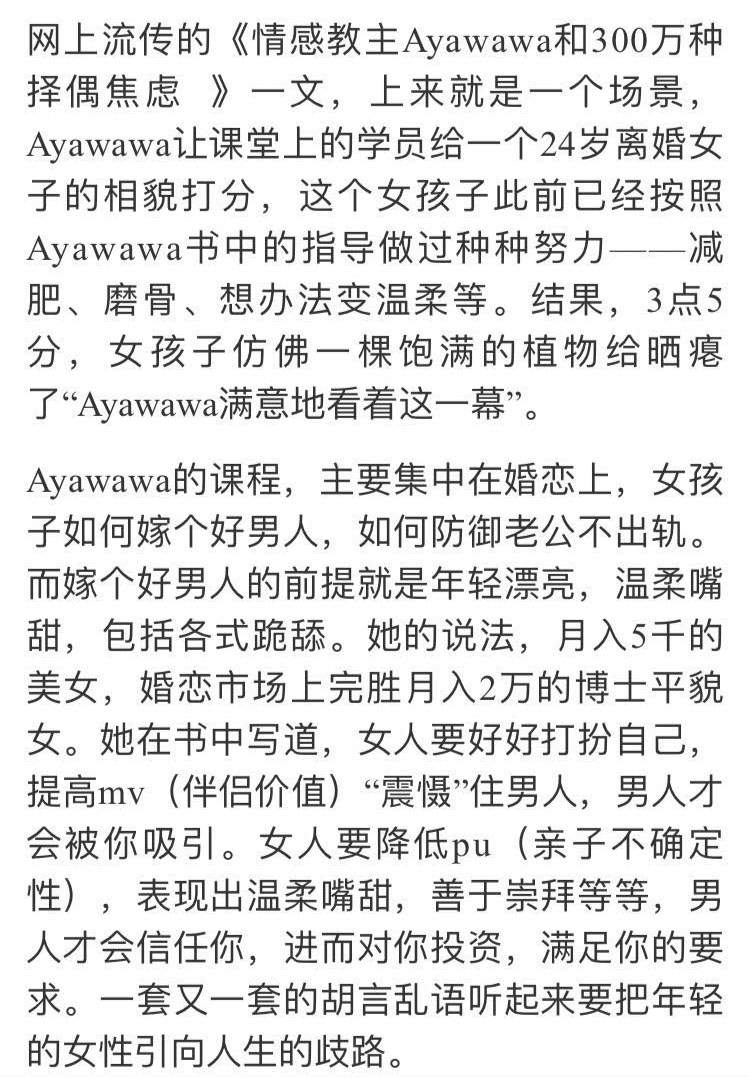 5月18日晚,@中國婦女報 官博發表文章,點名批評ayawawa:看了Ayawawa的文章,真想象不到朗朗乾坤下還有如此陰沉灰暗的教唆,男女平等國策下還有把女性往塵埃裏踩踏的課程,情感教主Ayawawa操持的真是歪理邪説、有毒雞湯。