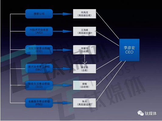 搜索公司(高級副總裁向海龍負責)、AI技術平台體系(AIG,副總裁王海峯負責)、智能駕駛事業羣組(IDG,副總裁李震宇負責)、智能生活事業羣組(SLG,COO陸奇負責)、新興業務事業羣組(EBG,總裁張亞勤負責)和金融服務事業羣組(FSG,高級副總裁朱光負責)。