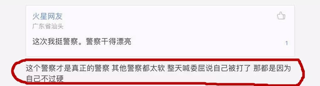 有為數不少的人竟然認為:只有上海這位警官的執法,才是“規範執法”,而在此之前所有捱揍的、遭遇襲擊的民警,那都是活該,他們都是因為自己執法不夠“教科書”才捱揍的。