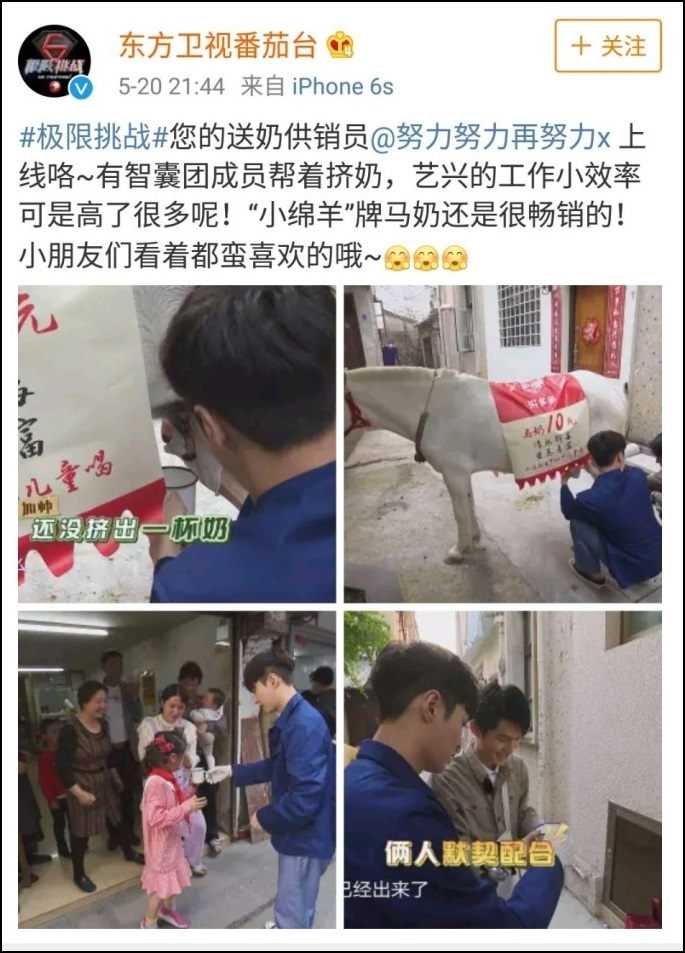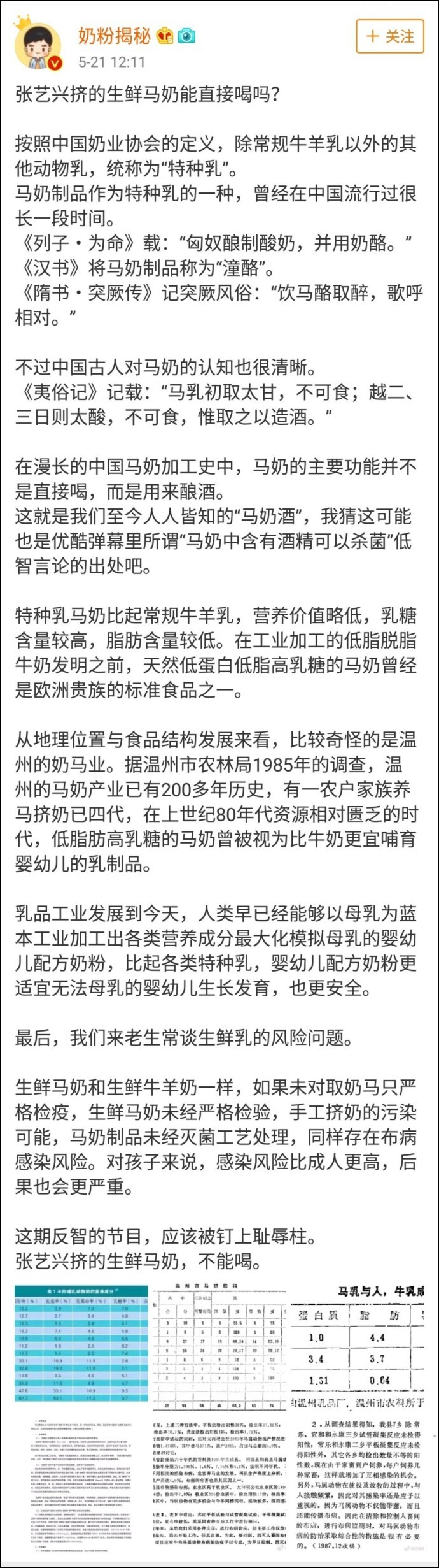 因此在昨晚《極限挑戰》節目播出後,@奶粉揭秘 再次提出批評,認為節目組事前沒有做足功課,安排節目嘉賓做現擠馬奶售賣的任務完全是“反智”,也容易誤導觀眾。