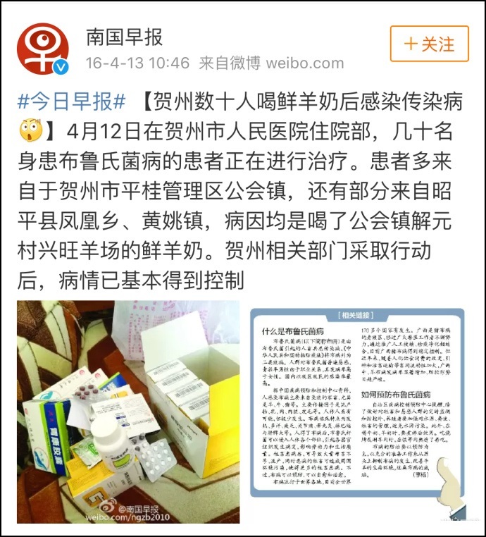 5月17日,澎湃新聞報道,廣東省紫金縣發生了一宗布魯氏菌病疫情,39人被送進醫院救治!經調查,疫情原因是村户飲用了未經有效消毒的散裝鮮羊奶!