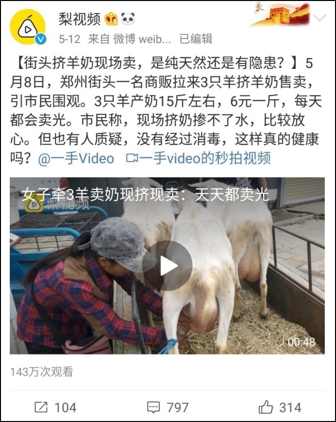 小編也查詢了一下,在數天前還有媒體報道在鄭州街頭也有商販直接拉來幾隻羊擠羊奶售賣,引市民圍觀。有網友提及,家中一般的消毒條件根本不可能達到高温殺菌的效果,非常不建議直接生喝鮮奶。