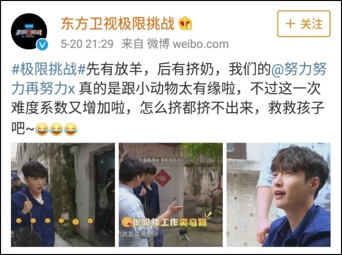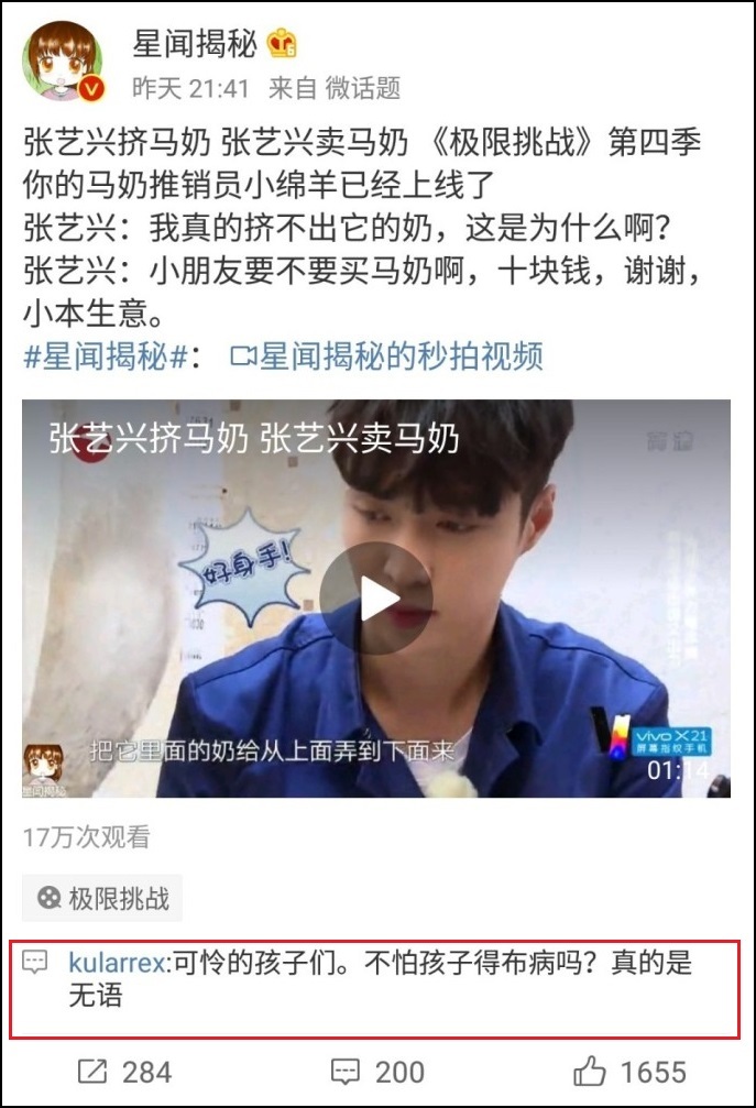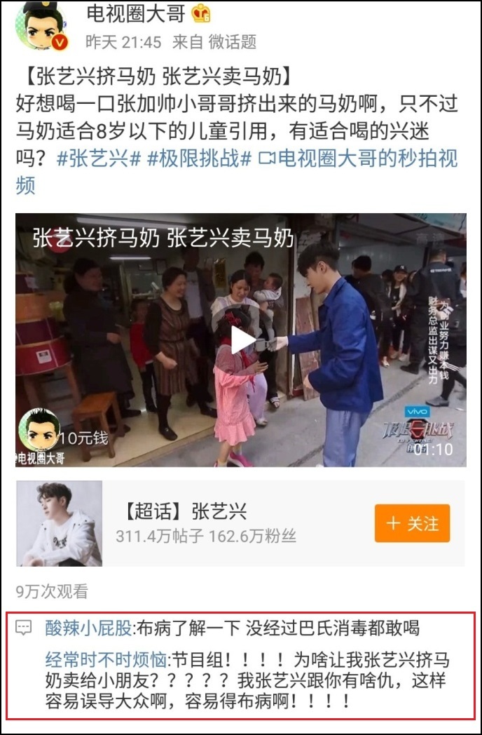張藝興在《極限挑戰》節目裏現擠馬奶,網友:布魯氏菌病瞭解一下_風聞