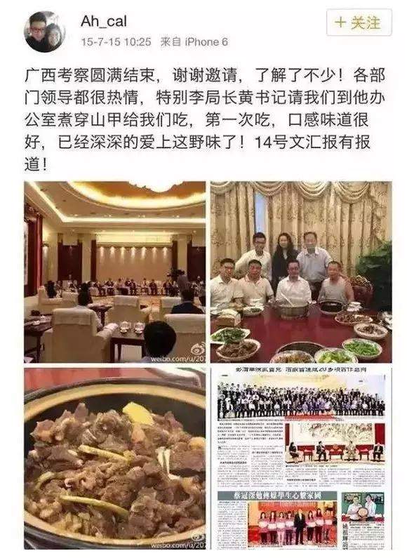 去年2月6日,一條“廣西官員請吃穿山甲”的微博被網友翻出,一名香港男子曾在2015年發微博稱在廣西考察期間,被當地部門領導請到辦公室吃穿山甲。