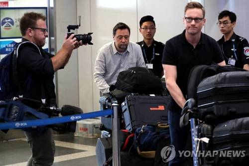 5月22日上午,北京首都機場,外媒記者們正準備搭乘高麗航空包機赴朝。(韓聯社)