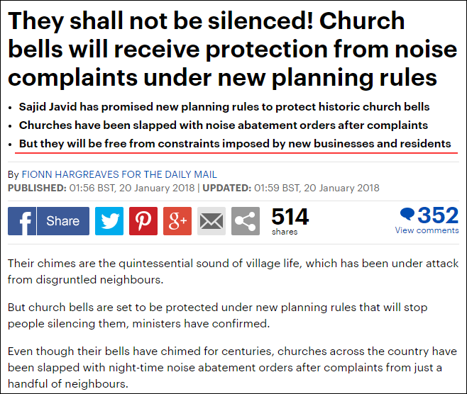 無獨有偶,2018年1月,英國桑德維奇鎮的居民抱怨聖彼得教堂的鐘聲擾民,上訪之後,鎮政府仍然認為需要保留這一鎮上的文化特色