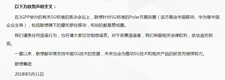 首宗錯: 5月11日聯想集團首次應對,發佈闢謠聲明,董事長楊元慶聲明內容以投票Polar迴避投票高通LDPC之舉,留給網絡避重就輕非誠之意助燃輿情,本次聲明為聯想集團增賦負能量。此舉建議楊元慶多看江蘇衞視《非誠勿擾》節目。