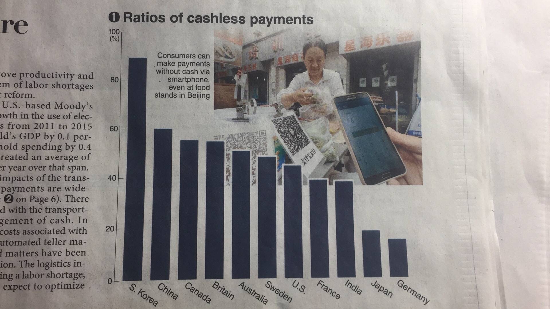在許多國家中,“無現金”支付方式的使用在所有種類的支付方式中的使用比例已超過了40%。使用智能手機掃QR碼(即二維碼)然後直接從銀行賬户中劃錢已經普遍得不能再普遍。