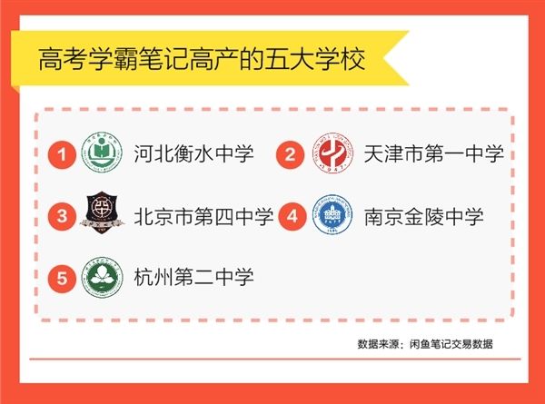 從學校來看,閒魚數據顯示, 河北的衡水中學是全國高考學霸筆記產出最高的高中,僅過去一年就產出了2500本學霸筆記。其次是天津市第一中學、北京市第四中學、南京金陵中學和杭州第二中學,均為各地標杆性的優質高中。