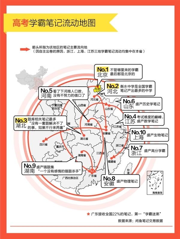 北京、河南、湖南的高考筆記的主要流向廣東,山東的則流向福建。江蘇由於是高考自主命題的省份,因此學霸筆記最終主要流向了本省份“自產自銷”。不過,因為江蘇考試眾所周知的高難度、高標準,廣東、山東學生也十分喜歡借鑑江蘇學霸筆記的精髓。