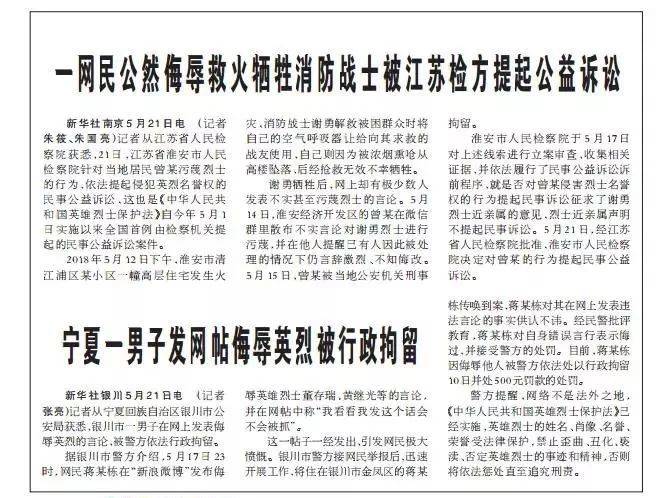 另一則新聞是銀川市一男子在網上發表侮辱英烈的言論,被警方依法行政拘留。