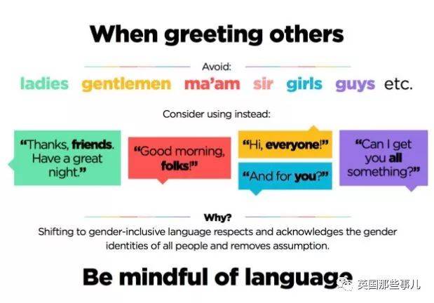 要避免使用“guys”(兄弟們)、“girls”(姑娘們)、“ladies”“Ma’am”(女士們)、“gentlemen”(先生們)這些詞;