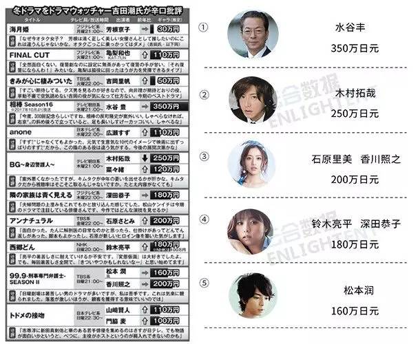 對比日本,根據週刊《FlASH》2018年整理出的冬季日劇檔「 演員單集片酬排行榜 」,排名第一的水谷豐單集片酬為350萬日元(約合人民幣21萬元),以一部劇平均10集左右計算,總片酬約為200萬元。自1996年柏原崇出演《惡作劇之吻》創下47萬元的高片酬記錄後,22年來日劇明星的片酬漲幅僅僅為425%。