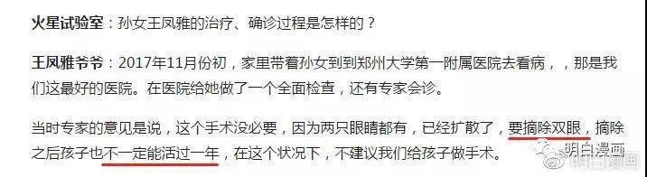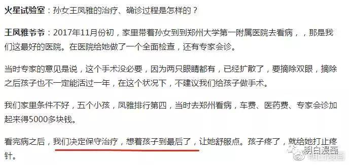 據説爺爺口述:2017年11月初,其家人帶着鳳雅來到鄭州大醫院看病,當時診斷的結果是:“兩隻眼睛都有癌細胞了,要摘除雙眼,且不一定能活過一年。”