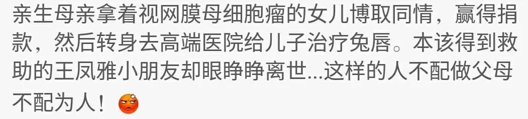 在王鳳雅最後在鎮衞生院住院的時間裏,楊美芹每天會接到無數謾罵的電話和短信,輿論經過一遍遍傳播,她似乎已經變成了一個惡魔——一個重男輕女的農村家庭,處心積慮地利用女兒的癌症,募集了 15 萬(最終確認的金額是 3.8 萬),用於兔唇的兒子的治療,還是在北京一個昂貴的私立醫院(實際上兒子的治療是由嫣然天使基金支持的),而重病的女兒被關在一個小房間內,最後被虐待致死。